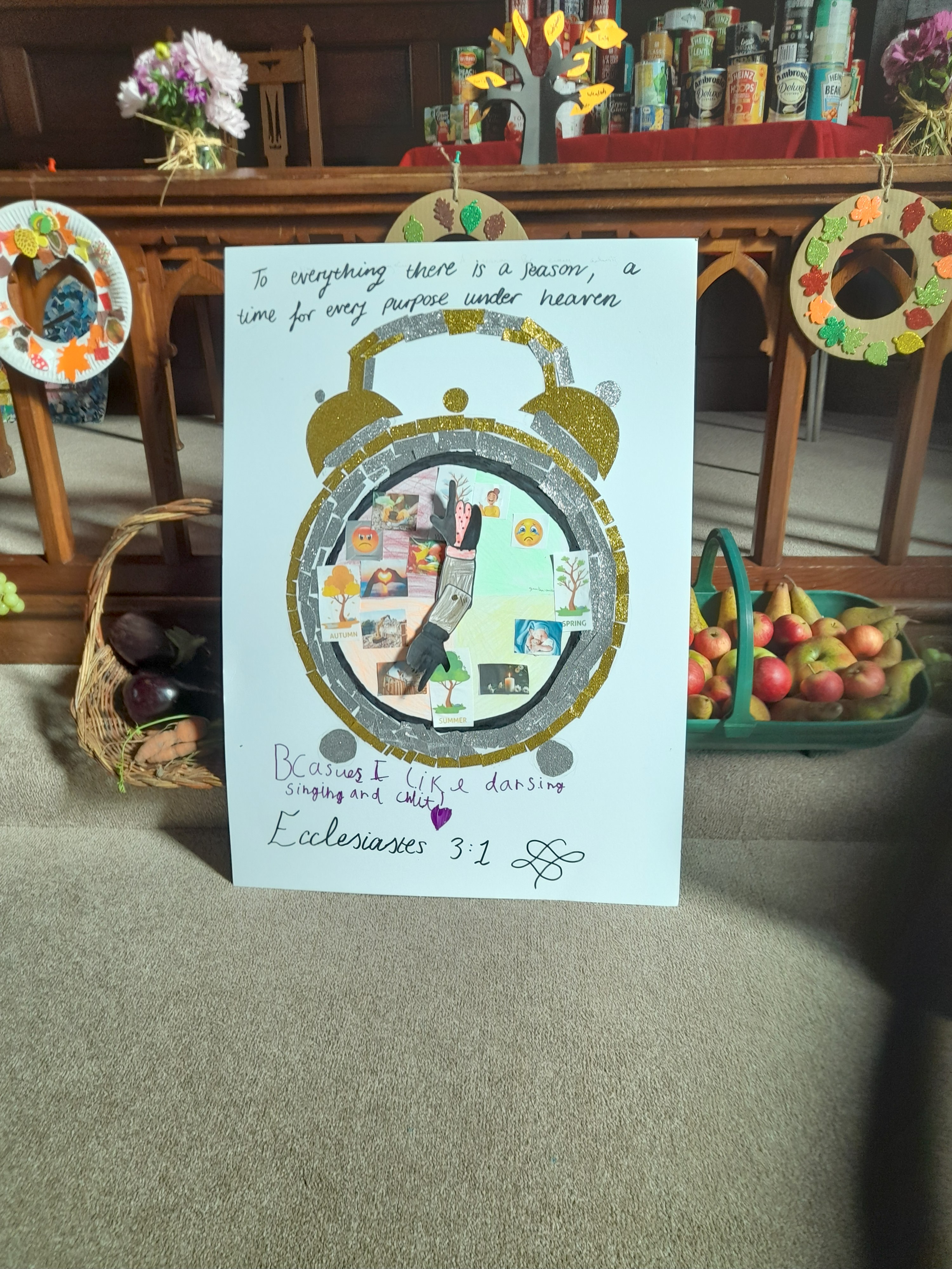 Harvest Service Sunday 6th October 2024: These 3 photos are from our Harvest service. The 1st one is of Rev Keith leading the opening prayer and during this he got the children to scatter leaves and then gather them all up again to fit his words.The other 2 are of the craft the children made during the service using the leaves and they then came forward to explain what they have made.